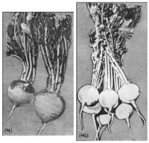 આકૃતિ 1 : સલગમ(B. compestris subsp. rapifera)ની મૂળ સહિતની વનસ્પતિ : (અ) ‘પુસા ચંદ્રિમા’ જાત, (આ) ‘પર્પલ વ્હાઇટ ગ્લોબ’ જાત