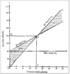 ઉપરના આલેખમાં AB સ્થિર ખર્ચની રેખા છે. આ સ્થિર ખર્ચ અપેક્ષિત મર્યાદામાં જ રહેતો હોવાથી એકમોનાં ઉત્પાદન અને વેચાણનો સ્થિર ખર્ચ રૂ. 80,000 જ આવે છે. એનાથી ઓછો કે વધારે આવતો નથી. AC કુલ ખર્ચની રેખા છે. કોઈ ઉત્પાદનના બિંદુએ રેખા AB અને રેખા AC ઉપર તે ઉત્પાદનબિંદુને અનુરૂપ બિંદુઓ વચ્ચેનો તફાવત, ચલિત ખર્ચ દર્શાવે છે. એકમદીઠ વેચાણકિંમત રૂ. 10 છે, માટે જુદી જુદી સંખ્યાના એકમોનું વેચાણ થતાં જે રકમ મળે છે તે OD રેખા દ્વારા દર્શાવવામાં આવી છે. આમ, કુલ આવકની રેખા OD છે અને કુલ ખર્ચની રેખા AC છે. આ બે રેખા એકબીજાંને E આગળ છેદે છે. E બિંદુમાંથી ડ્ડ અક્ષ અને જા અક્ષ પર લંબ દોરતાં તે ડ્ડ અને જા અક્ષને અનુક્રમે બિંદુ F અને બિંદુ G આગળ મળે છે. આનો અર્થ એ થયો કે OF જેટલું ઉત્પાદન અને વેચાણ કરવાથી રૂ. 1,60,000ની આવક અને રૂ. 1,60,000નો ખર્ચ થશે, જેથી પરિસ્થિતિ સરભર થશે.