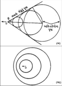 આકૃતિ 1 : (અ) ધ્વનિતરંગોના વેગથી બમણા વેગથી જતો પદાર્થ. ગતિ કરતો પદાર્થ તેની સાથે સંકળાયેલ ધ્વનિતરંગોના પૃષ્ઠથી આગળ રહે છે, આ પરિસ્થિતિમાં આઘાતવેગ પ્રકારનું શંકુ આકારના સપાટી દ્વારનું દબાણનું સ્પંદ સર્જાય છે; જે સૉનિક બૂમનું કારણ છે. sin θ= (ઘ્વનિ વેગ)/(પદાર્થનો વેગ); (આ) ધ્વનિતરંગોના વેગથી અર્ધો વેગ ધરાવતા પદાર્થ સાથે સંકળાયેલ ધ્વનિતરંગો. આવી પરિસ્થિતિમાં પદાર્થ હંમેશાં તરંગપૃષ્ઠની અંદર વિસ્તારમાં જ હોય છે.